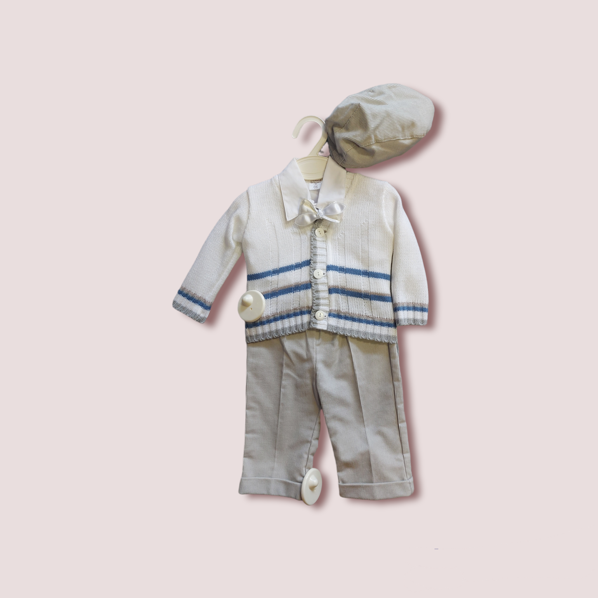 Nohavice, košeľa, sveter, motýlik a baretka