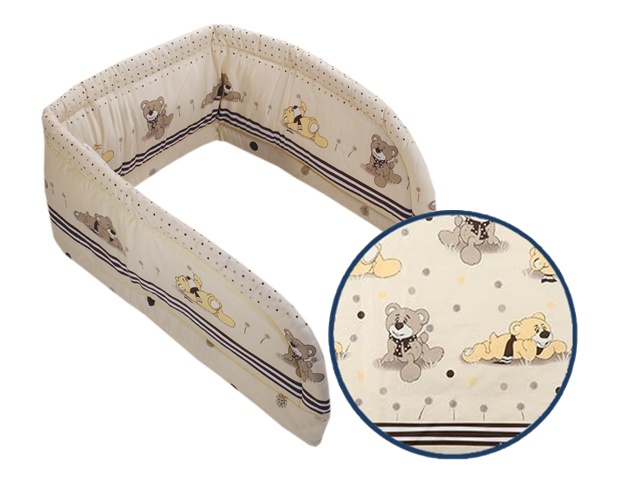 zaoblené ukončenia, všité látkové pásiky umožňujúce upevnenie k postieľke,