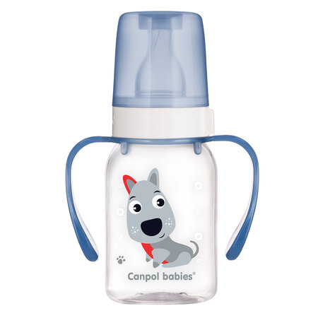 Canpol babies Fľaša s úzkym hrdlom a držadlom 120 ml CUTE ANIMALS modrá